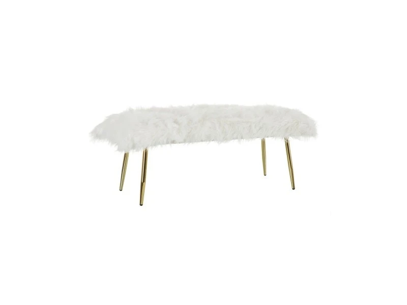 Bout de lit élégant et classique avec pieds en métal doré mat et assise confortable en fausse fourrure amovible blanche.