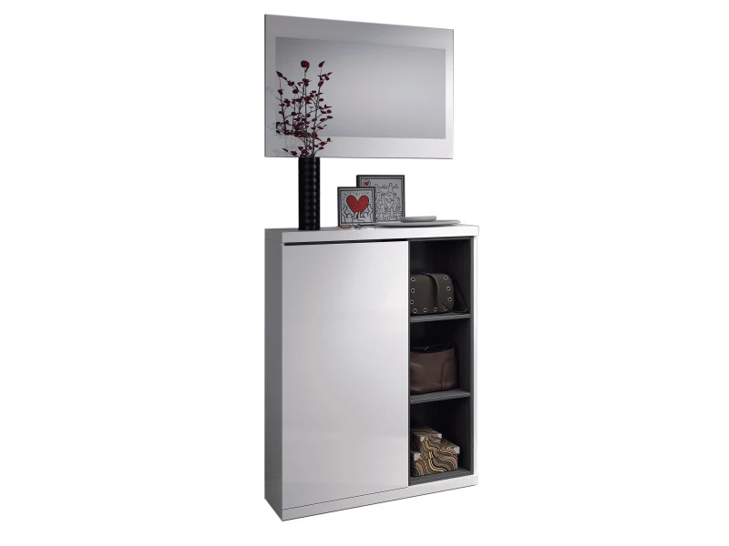 Meuble d’entrée avec une porte servant d’étagère à chaussures, trois étagères latérales et un miroir.