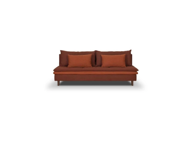 MASSA Banquette convertible avec double coussins d’assise + 2 grands coussins de dossier + 2 coussins lombaires – structure en pin massif et panneaux de particules – suspension d’assise en ressorts métalliques plats – Pieds en bois massif teinté noyer – Tissu 100% poylester 350gr/m2 facile d’entretien.