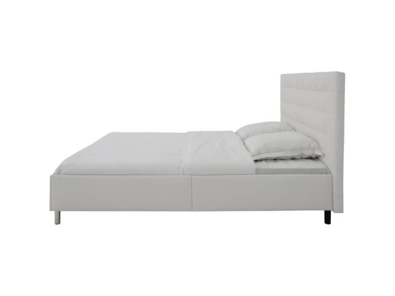 Lit 180×200 cm avec tete de lit revetement PU coloris Blanc – Structure Panneaux de particules, bois dur, isorel – Garnissage mousse polyéther densité 16 kg/m3 – Ouate 350 g/m² et 200 g/m² – Revetement 65% PU 21% Polyester 14% Coton